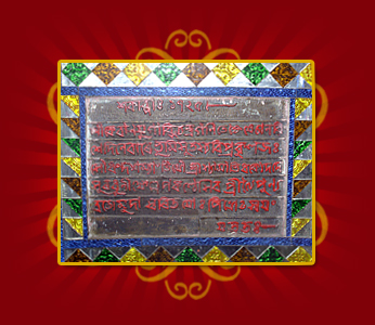 The name of the person who was creator and the donor for the establishment of Temple is written as 'Viprakulajah Shyamabhisheken Dadou Saundh', it means, Shri Syama Kaviraj who was born in Brahmin race who bestowed the Temple. The location of Temple is mentioned as 'Surdhuni shetropakanthey'. Surnidhi is better known as Ganga which is present in Narad Muni's melodious music of Veena and reaches to Lord Vishnu. Thus it means near the river Ganga, the place where Temple is today at Zakaria Street is not far away from the flowing river, so it may be possible during that period river was nearer to it.